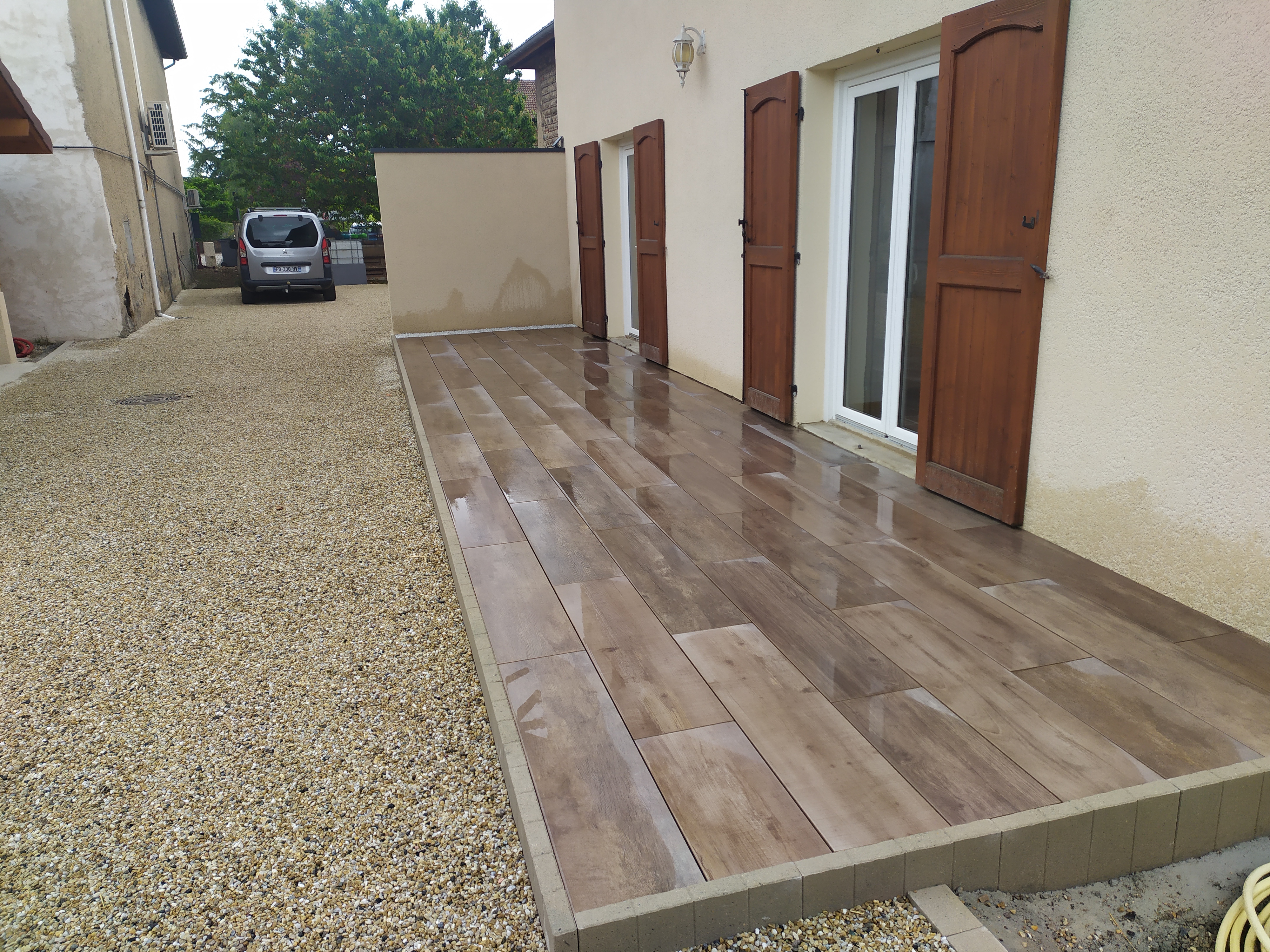 Réalisation terrasse et entrée de garage en béton drainant. Travaux réalisés comme prévu (délai et qualité). Aspect conforme à nos attentes. Équipe professionnelle et efficace.